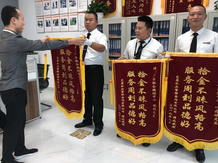 近日,浙江绿城保安服务有限公司第三区域广孚联合国际中心三名保安队员因为拾金不昧事件,收到了业主赠送的“拾金不昧风尚高,服务周到品德好”三面锦旗,这三名保安员将捡到价值1万多元的苹果笔记本电脑完好无损的归还失主,赢得了业主的赞美和肯定。