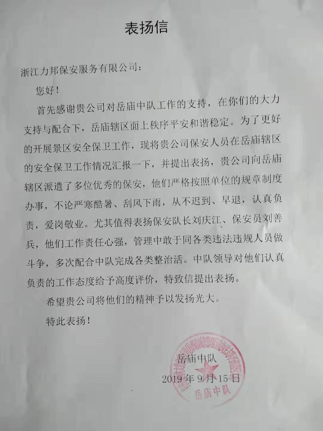 2019年9月15日,浙江力邦保安服务有限公司项目二部岳庙中队收到客户单位的书面表扬。