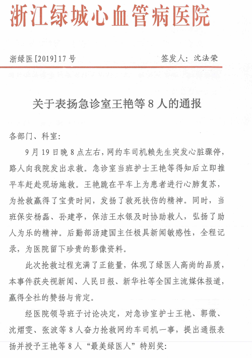 本次事件获得了央视(CCTV13)新闻、人民日报、都市快报、青年时报和今日头条、百度网、阿里巴巴正能量网等主流媒体报道,获得了广大市民的赞扬和肯定。绿城医院对我司两名保安队员杨磊、孙建亭予以通报表扬,授予最美“绿医人”特别奖,并奖励两人各三千元人民币现金,同时,公司已下发通报,号召全体员工向杨磊和孙建亭通知学习,忠诚履行职责,做人民的忠诚卫士,为保一方平安做出更大的贡献。