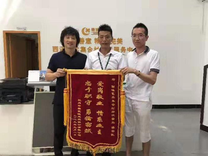 2019年9月8日晚,西溪艺术家集合村商户将一面写有“爱岗敬业,情系业主,忠于职守,勇擒窃贼”的锦旗送到浙江绿城保安服务有限公司保安队长钱柏钰手中,感谢队员们英勇无畏,勇抓窃贼,保护了商户的财产安全。