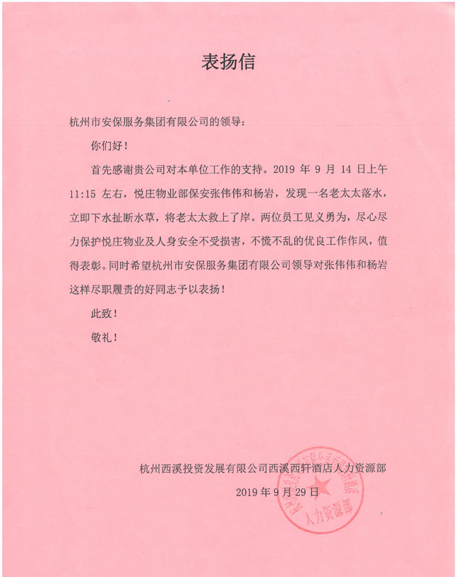 事后,客户单位特意向公司发来表扬信,对张伟伟、杨岩处理险情及时,尽心尽责保护了悦庄物业及人身安全不受损害的行为进行表彰,对他们表现出的不慌不乱的优良工作作风和扎实的业务技能进行高度的赞扬。同时更深深感谢公司培养出这样一批见义勇为、尽心尽责的队员。