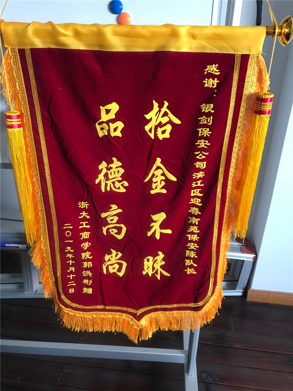 2019年10月8日,一辆电瓶车驶过迎春南苑北门时,突然掉落下一个包,银剑保安公司滨江区迎春南苑保安陈队长看见立即连忙追喊失主,但由于周围过于吵闹骑车人并未听见继续前行而去。陈队长捡起包检查包内物品,内有银行卡2张,现金600元整。事发时间正处于上班早高峰期,东门堵车严重,陈队长继续回到岗位维护秩序,处理完事情后立马回到捡到包的地方继续等待失主,恰好碰见前来寻找包的失主,陈队长将包完好无损的交还给失主。失主很感激,拿出200元感谢费,陈队长当场拒收并表示这是自己应该做的事情。过了几天,保安传达室收到了失主送来的锦旗。陈队长拾金不昧的品质得到了领导的一致好评!