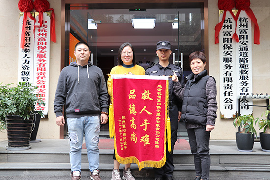 11月21日,鹿山街道蒋家村李女士带着一面书有“救人于难,品德高尚”的锦旗,来到杭州富阳保安服务有限责任公司,向救人不留姓名的该公司特保队员陈衡致谢。