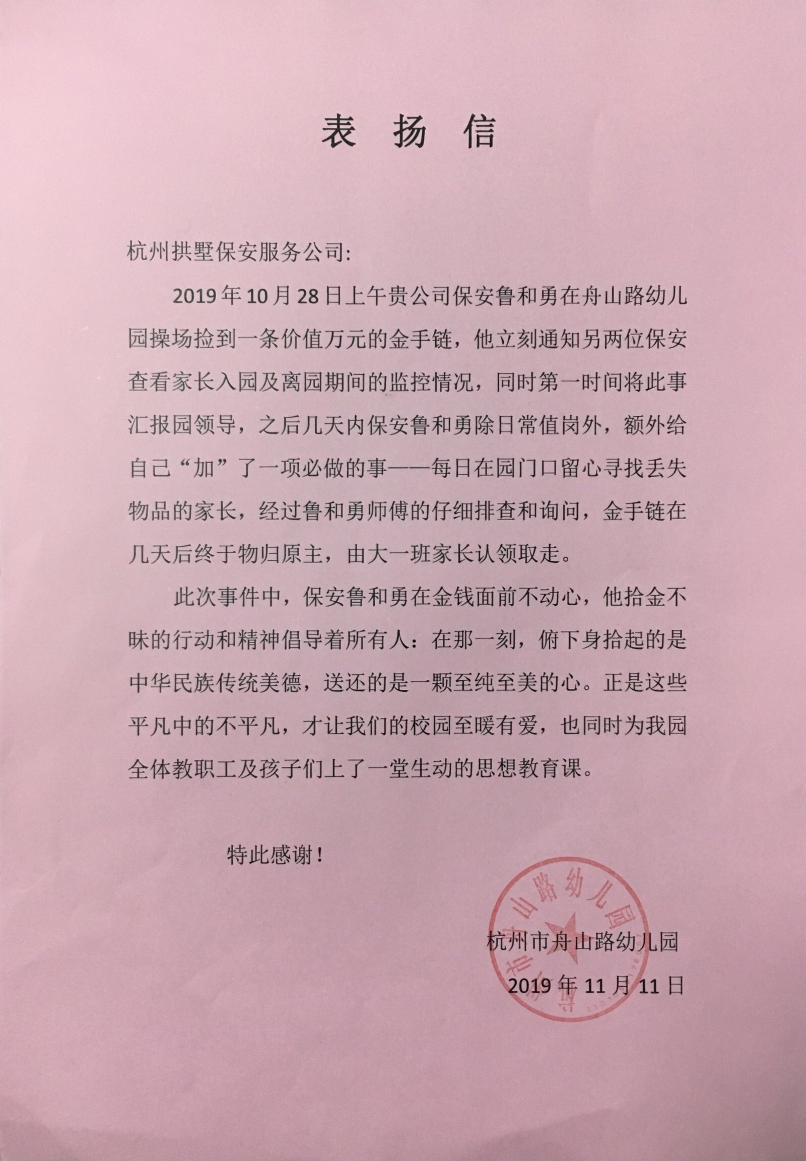 10月28日,杭州拱墅安保服务有限公司驻舟山路幼儿园保安员鲁和勇,在园内操场上捡到一条价值万元的金手链,他第一时间将此事汇报园领导,通过查看监控以及排查询问,最终成功将金手链物归原主。 舟山路幼儿园特致信来我公司,赞扬鲁和勇拾金不昧的行动和精神,他的优秀品格值得我们去学习,指引我们要共同弘扬中国优秀的传统美德,让社会处处充斥着温暖的气息。
