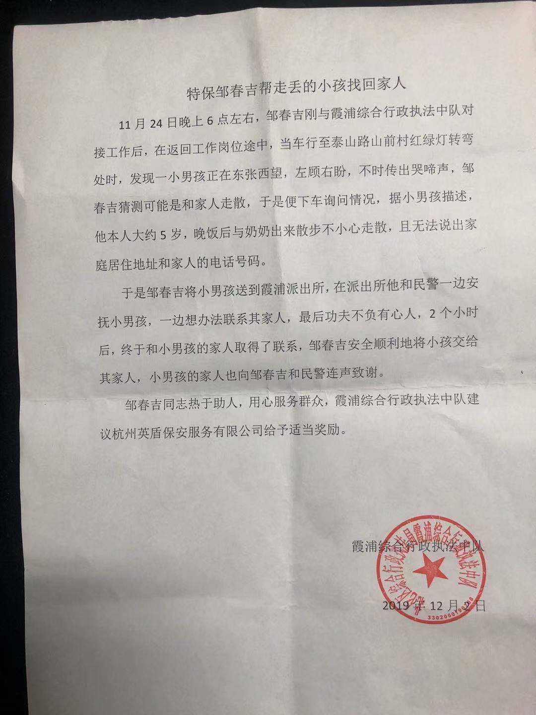 12月2日杭州英盾保安服务有限公司收到了宁波北仑区霞浦综合行政执法中队的一封表扬信。信中表扬了11月24日当晚,杭州英盾保安服务有限公司驻霞浦驻点的特保队员邹春吉在下班途中,发现路上一位走失的小孩,他第一时间将此事汇报领导,并把小孩送至派出所,最终帮其联系上家人。