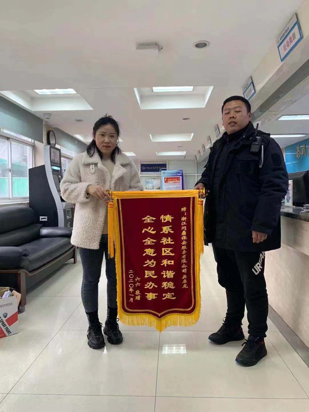 2020年1月4日,问鼎公司吴启龙收到夕照小区业主张小姐一面印有“全心全意为民办事,情系社区和谐稳定”的旌旗,对他平时的工作给予了肯定。