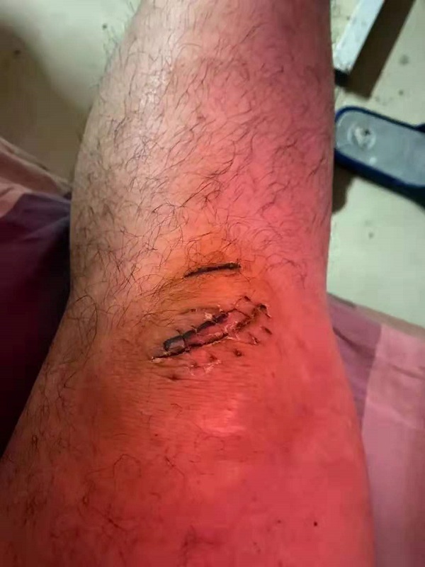 在宿舍消毒时,齐伟的腿被划伤了。上了点消炎药,他仍然坚持在工作岗位上。祸不单行,过了两天,园区车辆管理时,脚踝又扭伤了,缝了8针。正准备趁过年的时候好好休养一下,哪知,赶上了这来势汹汹的新型冠状肺炎。