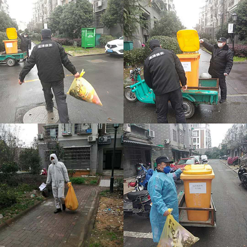 五常街道疫情相对严重,居家隔离户比较多,我们的保安员除了日常防疫执勤工作以外,还要负责给来往车辆消毒、隔离户医用垃圾(废弃口罩为主)和生活垃圾的回收工作,保安员拿专用的垃圾桶上门回收,然后放到指定地点,处理突发事件及临时任务等等。