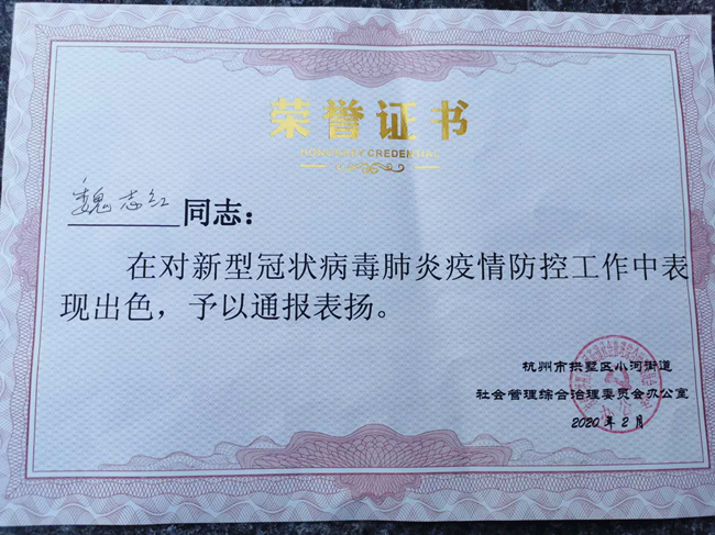 在小河街道重点防疫岗位上,魏队长不惧病毒威力,逆行而上,履职尽责。在做好自身防护和本职工作的同时,魏队长竭尽所能地配合街道做好防控工作,消毒杀菌、防疫督促检查,检测进出人员体温,虽然忙的连轴转,但是他始终不叫苦不叫累,出色地完成每一项工作,他的忘我精神得到了街道领导和工作人员的高度认可,获得了拱墅区小河街道社会管理综合治理委员会办公室颁发的抗疫防控荣誉证书。
