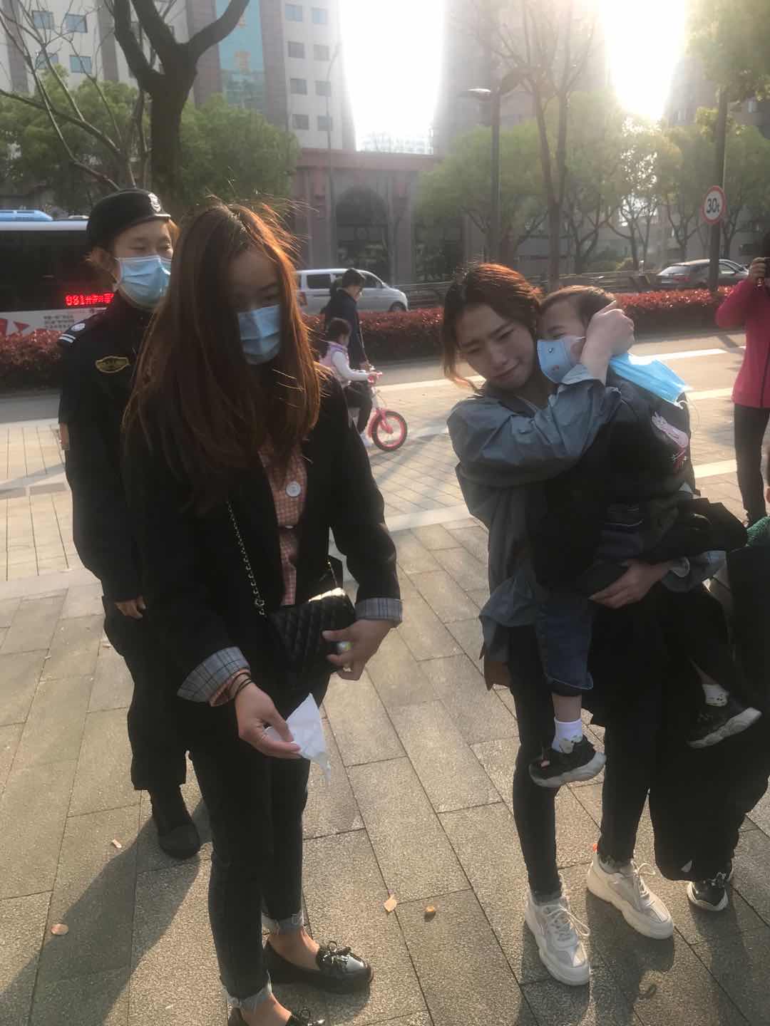 4月1日下午15点50分左右,樱花岗亭坐岗女队员王翠鹤在岗亭周边巡视期间发现一小朋友在哭闹。经过王翠鹤的耐心询问,小朋友哭着告诉说他找不到妈妈了,于是女队员把小朋友带到岗亭进行安抚。同时另外两名队员马冬、吕文杰则在樱花公园外围和公园里拿着小孩的照片寻找孩子的母亲。经过二十分钟左右的询问查找,刚好碰到正在焦急寻找小孩的母亲。通过队员拍摄的照片,孩子的母亲确认是她的孩子后,马冬、吕文杰把孩子母亲带到樱花岗亭并把小孩交到孩子母亲手中,孩子母亲一再表示感谢。