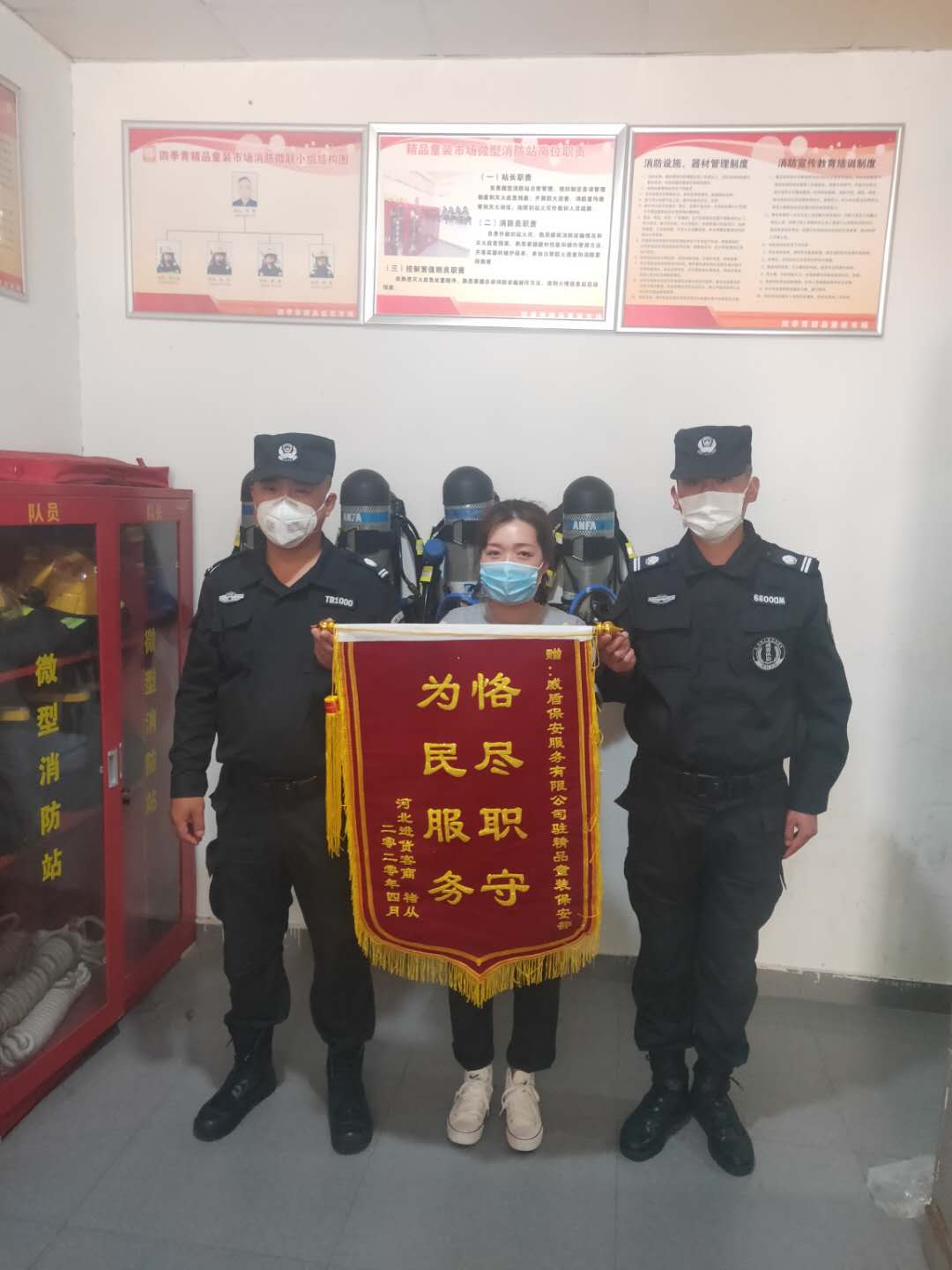 4月17日,一位河北客商给浙江威盾保安服务有限公司驻精品童装市场保安部送来一面锦旗,上书:“恪尽职守,为民服务”。