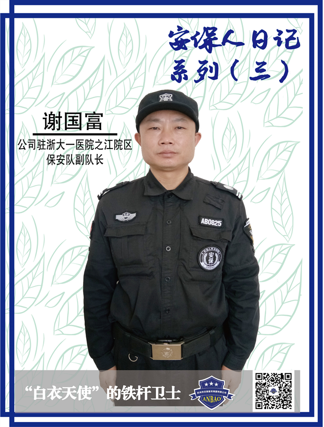 安保服务永远在路上,“把平凡的工作做扎实,恪尽职守,全心全意做好患者及医护人员安全保障工作,让患者安全就医,让医护人员安全行医,维护医院一方平安”始终是谢国富同志孜孜不倦的追求,穿上这样的保安服,我们骄傲,我们自豪,我们把这种自豪感深深地浇铸在我们流淌的血液中,让勇敢和奉献成为我们帽徽的浓缩,让顽强和执着成为我们肩章的沉淀。什么也不说,胸中有团火,这是浇铸过太阳的一捧火焰,这也是练就了无数男子汉的一捧火焰,它来自于人民,在它的光芒下,我们将勇往直前。一声“到”!一生到!