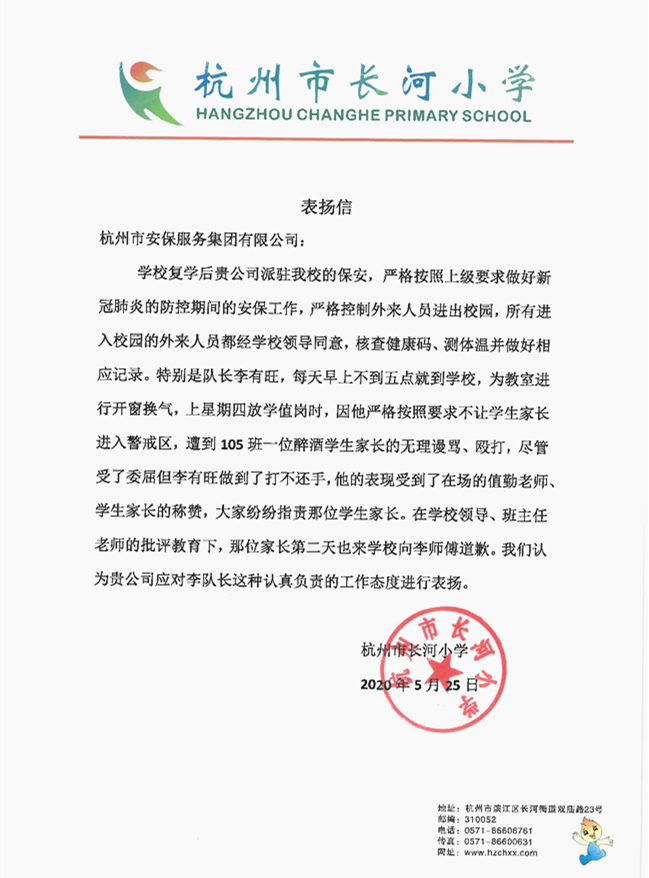 信中写到:学校复学后贵公司派驻我校的保安,严格按照上级要求做好新冠肺炎的防控期间的安保工作,严格控制外来人员进出校园,所有进入校园的外来人员都经学校领导同意,核査健康码、测体温并做好相应记录。特别是队长李有旺,每天早上不到五点就到学校,为教室进行开窗换气。上星期四放学值岗时,因他严格按照要求不让学生家长进入警戒区,遭到105班一位醉酒学生家长的无理谩骂、殴打,尽管受了委屈但李有旺做到了骂不还口,打不还手,他的表现受到了在场的值勤老师、学生家长的称赞,大家纷纷指责那位学生家长。在学校领导、班主任老师的批评教育下,那位家长第二天也来学校向李师傅道歉。我们认为贵公司应对李队长这种认真负责的工作态度进行表扬。