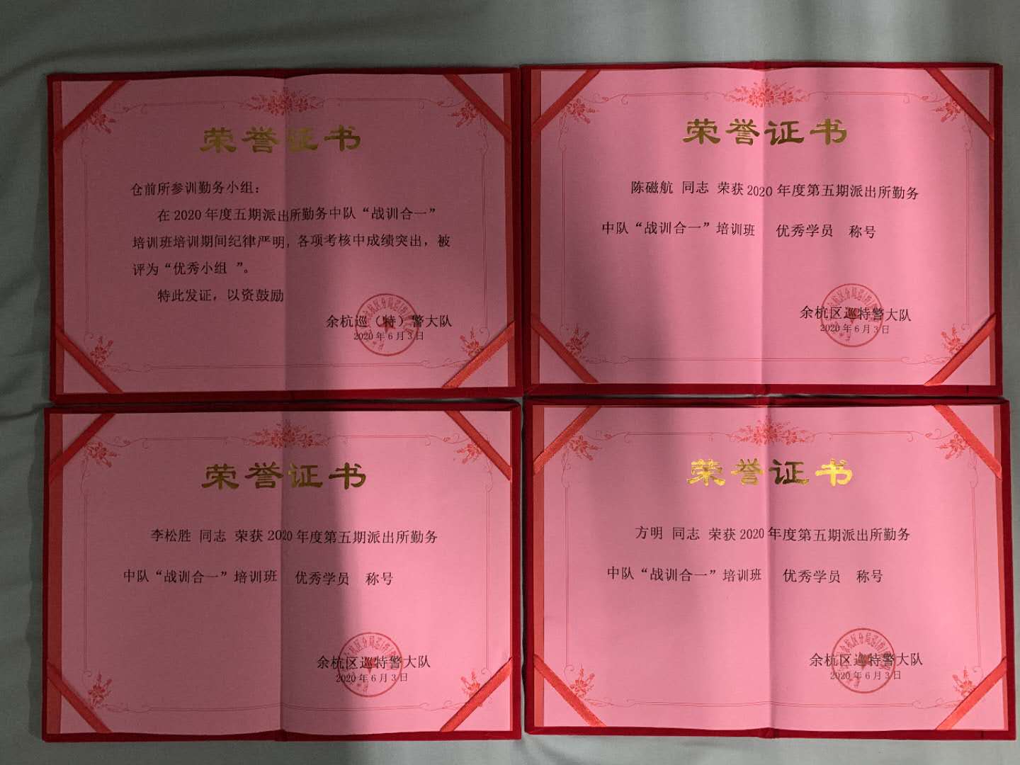 经过半个月的封闭式训练,在5名队员的共同努力下,仓前派出所取得了团体优秀小组的优异成绩,并且三名队员获得“优秀学员”荣誉证书。