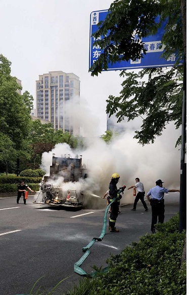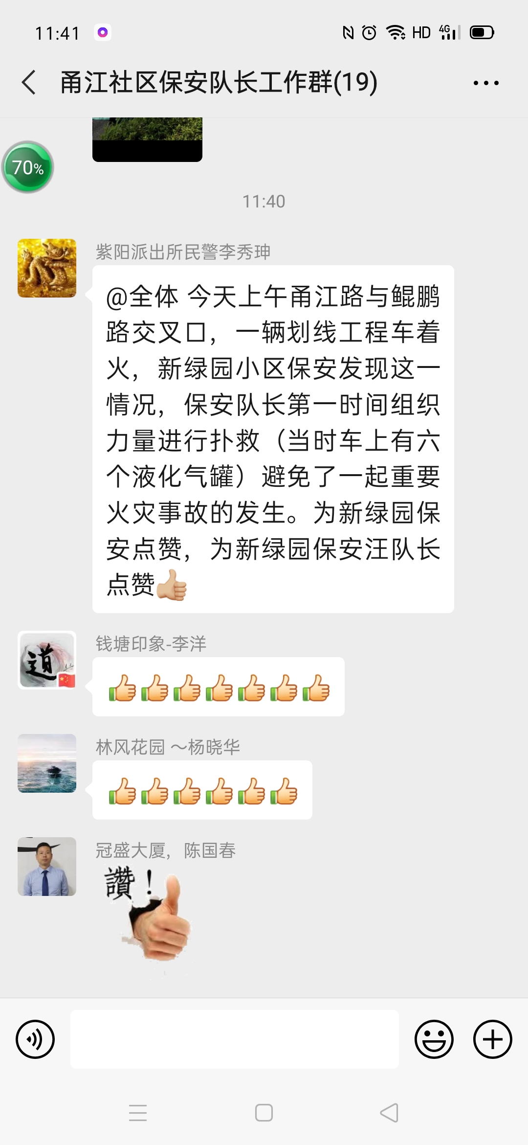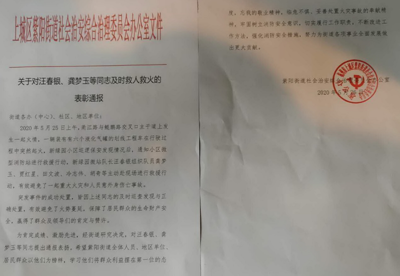 2020年5月25日上午,甬江路与鲲鹏路交叉口主干道上发生一起火情,一辆装有有六个液化气罐的划线工程车在行驶过程中突然起火,浙江绿城保安服务有限公司新绿园保安队巡逻队员发现情况后,立即通知小区微型消防站进行救援行动,新绿园微站保安队长汪春银组织队员龚梦玉、贾红星、田文波、冷志伟、胡奇等主动赴现场进行救援行动,有效避免了一起重大火灾和人员意外身伤亡事故。