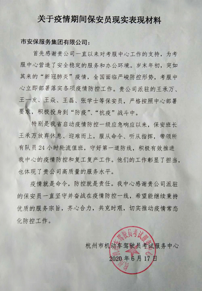 N*24小时坚守抗疫一线——杭州市安保集团保安队收到驻点单位的感谢信