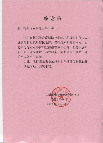这封来自建行省分行的感谢信,不仅是客户单位对德邦保安员们工作的认可,更加是对他们优良作风和奉献精神的认可。在接下来的工作中,所有的德邦保安员们会继续努力,共克时艰、共筑平安!