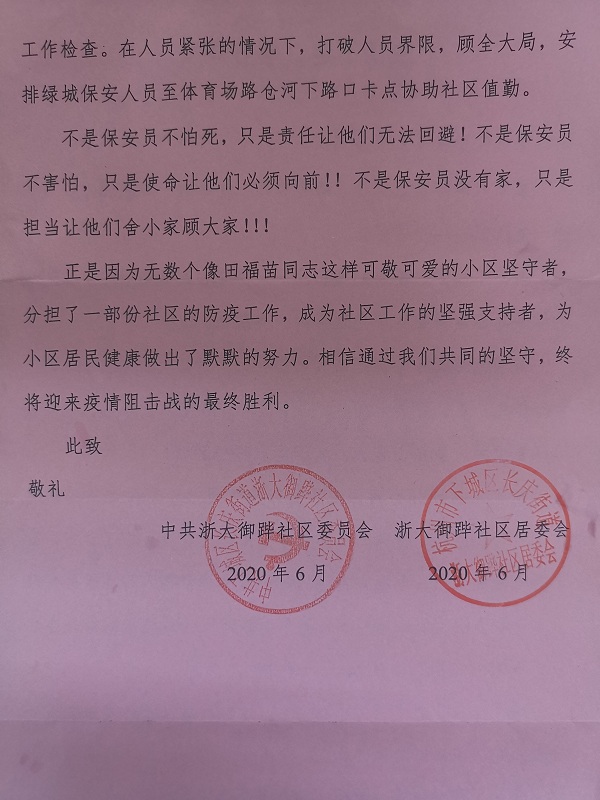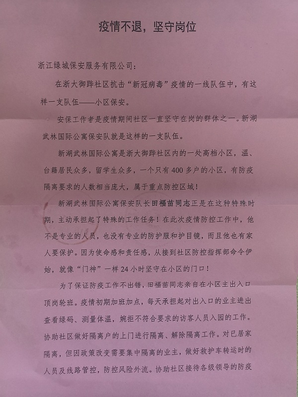 慎终如始,善作善战;众志成城,决战决胜。6月28日,浙江绿城保安服务有限公司收到长庆街道对新湖武林国际保安队长田福苗同志的表扬信,信中对田福苗同志疫情防控期间的工作表示充分认可和高度赞扬!