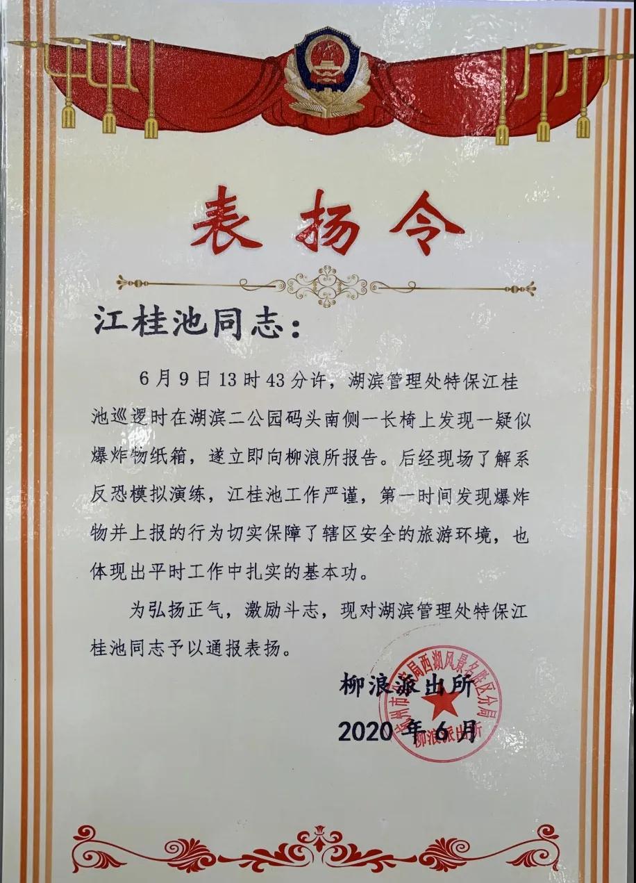 为弘扬正气,激励斗志,6月11日,柳浪派出所对此次事件中表现优秀的江桂池等同志进行了表彰。湖滨管理处及柳浪派出所分管领导参与颁发表扬令。