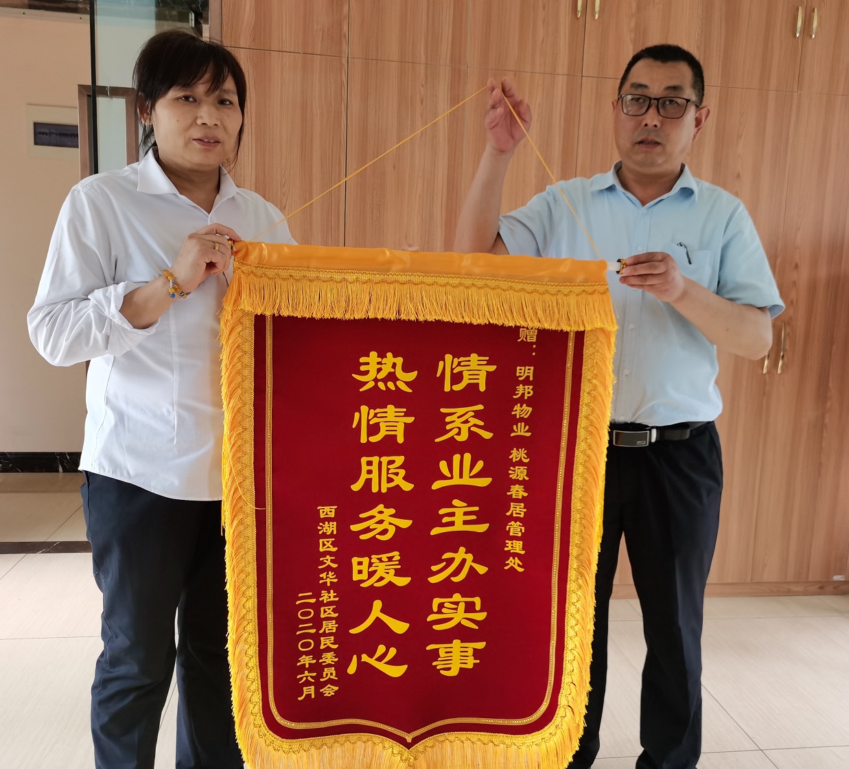 2020年6月30日,西湖区文华社区居民委员会领导专程来到我司项目部桃源村居管理处,送来写有“热情服务暖人心,情系业主办实事”字样的锦旗,并对公司在抗击疫情期间所做出的优质保障工作表示感谢。