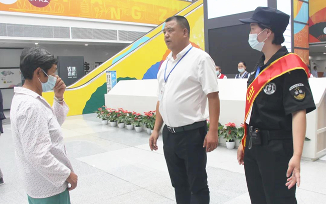 7月12日晚19点左右,我公司驻点杭州南站的班长杨绍辉正准备交接班时,接到南站一商户打来紧急电话,有人在其店门口喝醉酒欲闹事。杨班长听后随即召集几名队员以最快的速度到达现场,到现场后情况和大家想象中的大不一样。只见所谓的欲“闹事者”是一名50多岁的大伯,面色黝黑,衣着褴褛,落寞的坐在店门口,手里还拿着没喝完的酒瓶,浑身散发着酒气。嘴中还不时的反复念叨着:“怎么办?怎么办”?杨班长见状缓缓上前,小心地询问着大伯。