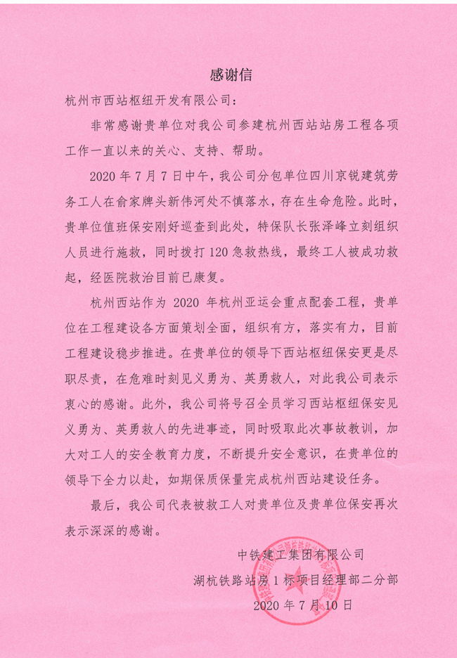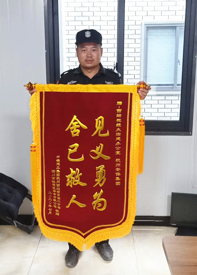 7月24日,我公司驻点保安队长张泽峰勇救醉酒落水者受到客户单位表扬,并赠与锦旗一面。