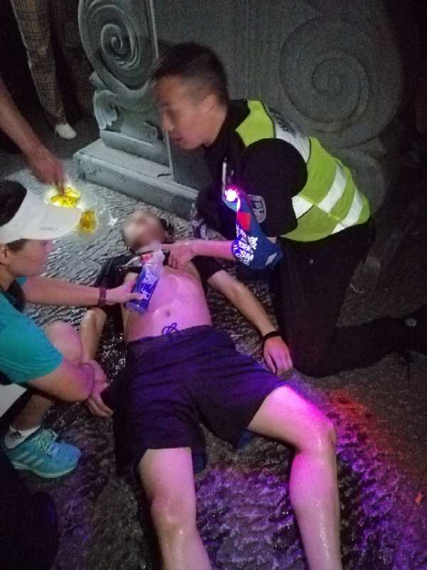 民警与巡逻队队员们立刻赶到现场。队员徐立峰见状立马俯下身,耳朵贴在小伙子胸前判断他是否还有呼吸和心跳。听到还有心跳的声音,徐立峰心稍微安了下来,猜测小伙子可能是天气太热,运动激烈导致脱水了。小伙子四肢僵硬晕倒在地,心律跳动很快,体温也很高。徐立峰赶紧拍了拍他,看他有没有什么意识。随后快速掀起他的衣服,顺带把自己身上的一瓶矿泉水浇上去,给他降降温。