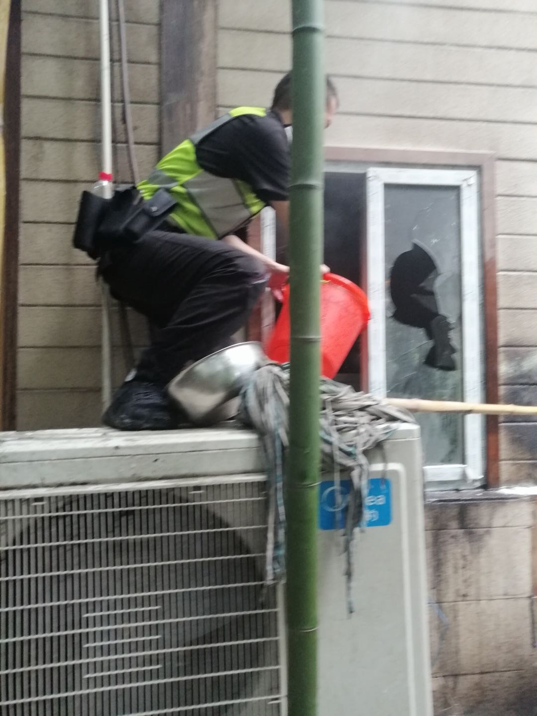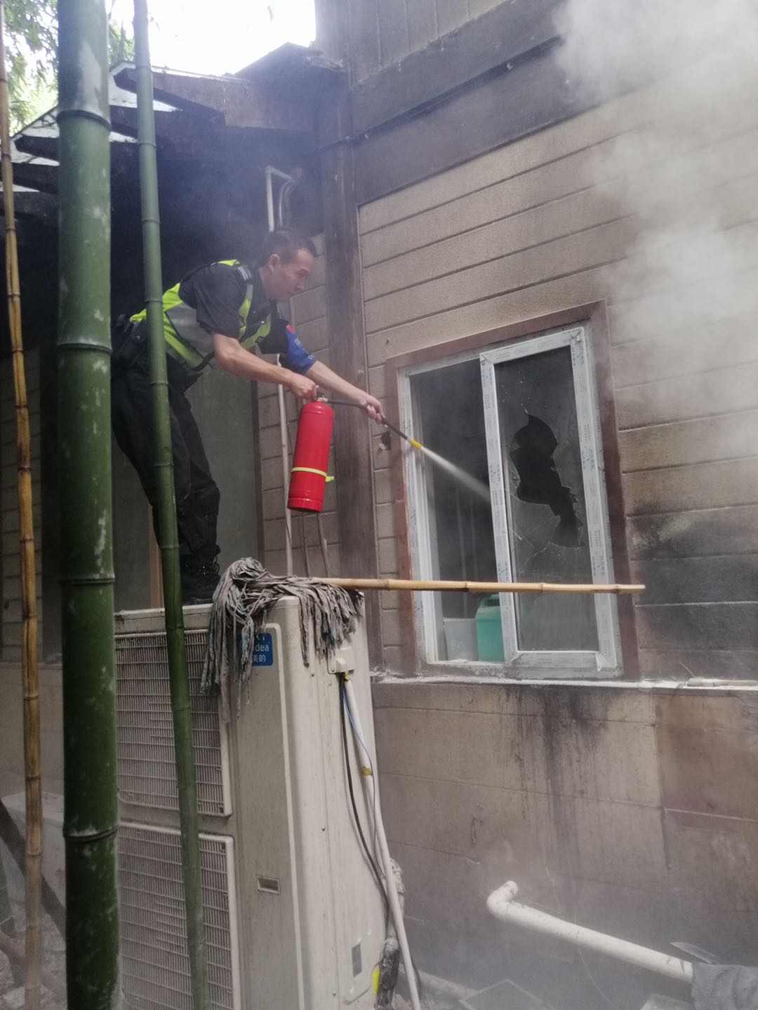 随后,徐立峰和徐杭玲破窗灭火,站到了空调外机上。灭火器换了一个又一个,对准火源处拼命喷射,经过十几分钟的努力,在消防车赶到之前,终于控制住了火势,烟管的火也灭了。万幸的是,没有人员伤亡。