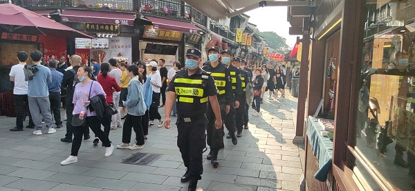 10月1日至10月8日的8天时间内,德邦保安派出10名业务能力强,形象素质佳的优秀队员,组成临时巡逻队伍,于杭州河坊街,协助公安和派出所管理景区秩序,服务来自全国各地的游客。