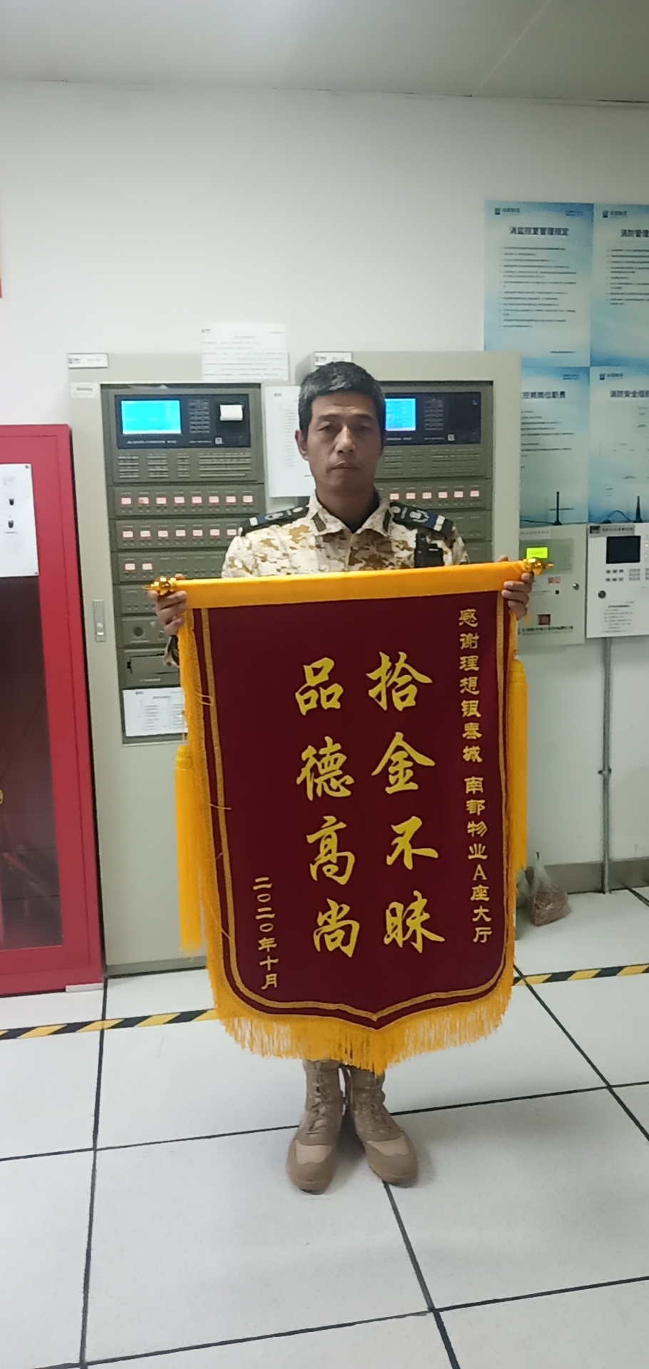 2020年10月17日凌晨01:44分,明邦保安公司驻理想银泰城秩序部肖新斌、在A座大厅巡逻时捡到了一部华为P40手机。经了解此手机价值4000多,而时下自己用的手机也就3000多块钱,而肖新斌并没有因此把手机据为己有,而是把手机上缴到物业管理处并协助管理处,并在各出入口及通道显眼处张贴失物招领信息,终于在10月17日晚上6点钟失主出现,经核验认领到自己丢失手机,失主表示并没有想到手机还能找到,对我明邦保安拾金不昧,品德高尚的服务精神表示感动和感谢,次日特赠一面写有“拾金不昧,品德高尚”锦旗以表心意。