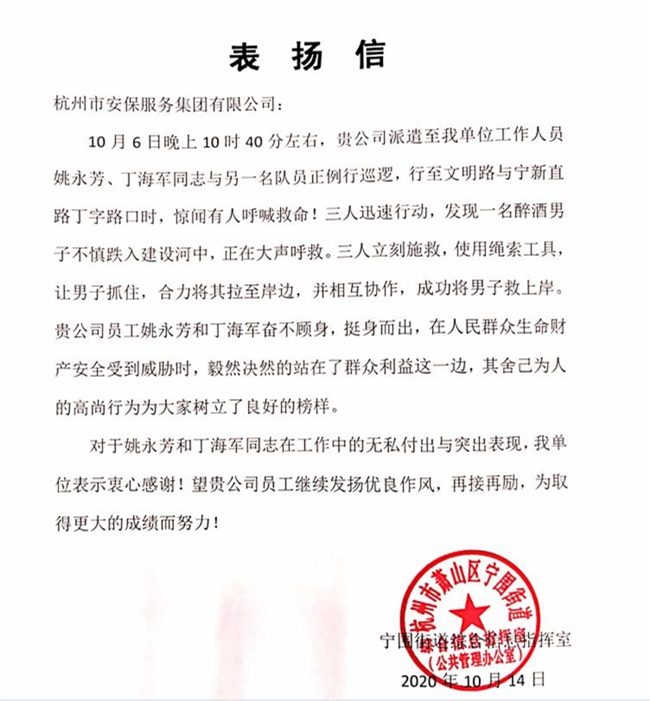10月6日晚,公司驻宁围街道办事处安保队员姚永芳、丁海军正在新华村辖区内巡逻值班,行至文明路与宁新直路路口时,突然听到有人呼喊救命!二人马上循声跑到建设河边,看见四周几名手足无措的群众正在呼救,原来是一名醉酒男子不慎落水。