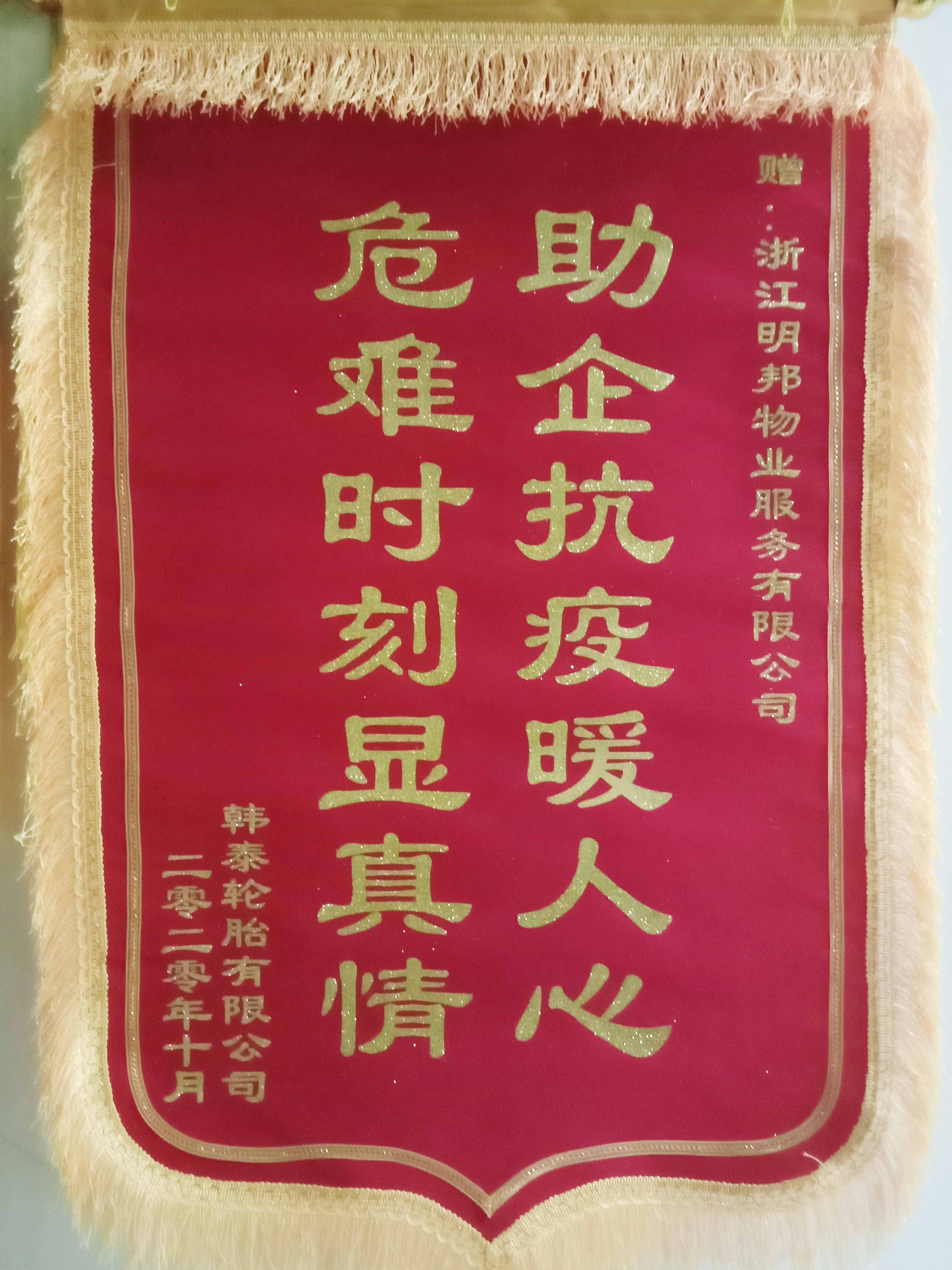 在今年突发以来的疫情环境下,韩泰轮胎作为开发区率先复产复工企业,离不开明邦保安公司保安团队的支持和付出,公司驻韩泰队长杨柳带领全体队员,恪尽职守,为客户单位坚守“第一防线”,不惧辛劳完满的完成本单位布置的工作任务,明邦公司在驻韩泰公司期间,保障了客户单位物品搬岀入及遏制治安事件的发生,保障了甲方员工及 财产的损失。特赠锦旗及表扬信以示感谢和鼓励。