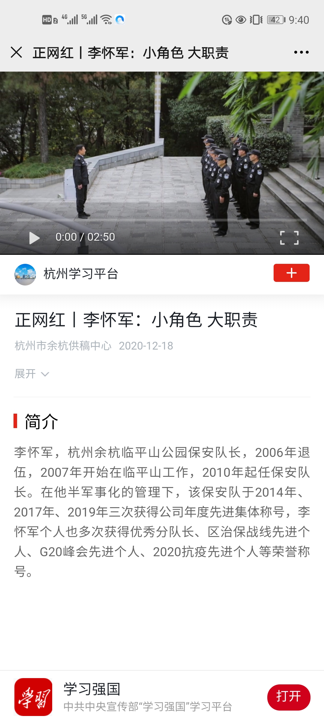 李怀军,杭州余杭保安服务有限公司派驻临平公园保安队长。2006年退伍,2007年开始在临平山工作,2010年起任保安队长。在他半军事化的管理下,该保安队于2014年、2017年、2019年三次获得公司年度先进集体称号,李怀军个人也多次获得优秀分队长、区治保战线先进个人、G20峰会先进个人、2020抗疫先进个人等荣誉称号。