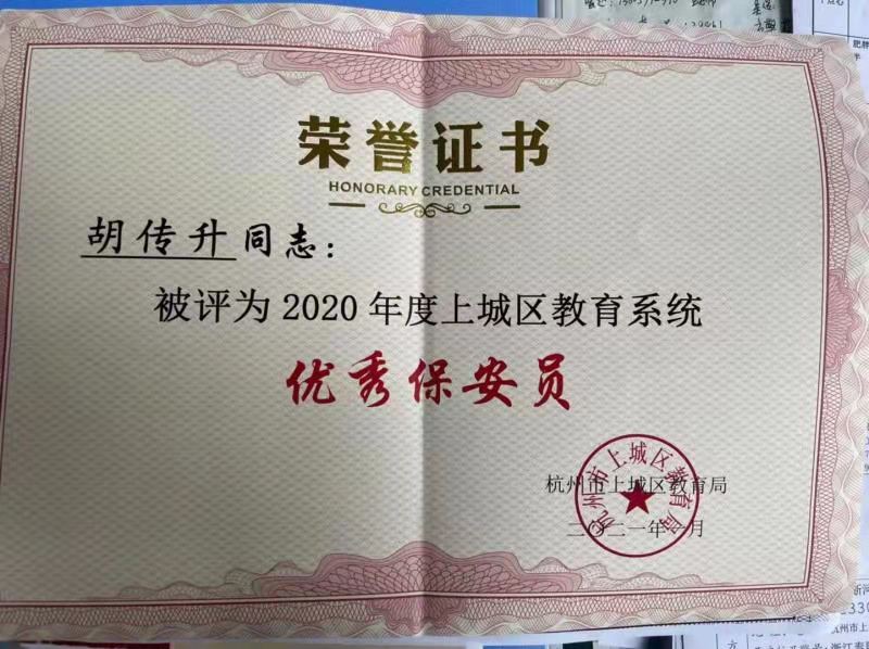 近日,杭州市上城区教育局组织评选“2020年度上城区教育系统优秀保安员”,经过评选力邦保安驻杭州市上城区喜洋洋幼儿园保安员胡传升同志被授予2020年度上城区教育系统“优秀保安员”。