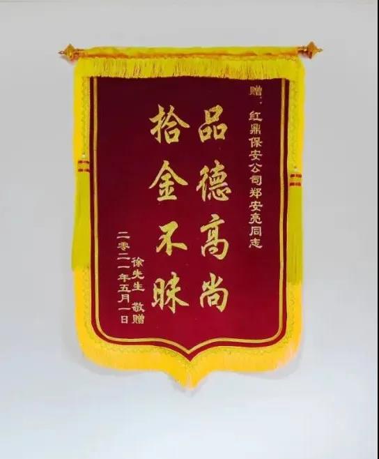 事后,失主徐先生送上了锦旗以表感谢。郑安亮同志拾金不昧的品质值得大家赞赏和学习!