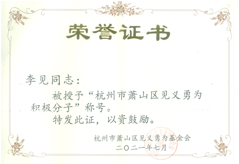 2021年8月2日上午,浙江卫邦保安公司驻闻涛小学保安班长李见被杭州市萧山区见义勇基金会授予“杭州市萧山区见义勇为积极分子”称号。