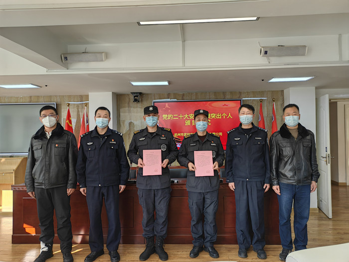 近日,浙江省公安厅发文对全省保安服务行业党的二十大安保成绩突出集体和个人予以通报表扬,集团安保部员工邵伟明、王志刚荣列其中。1月11日下午,杭州市公安局拱墅区分局基层基础管理大队詹观生副大队长、民警王建专程莅临集团,送上贺函。
