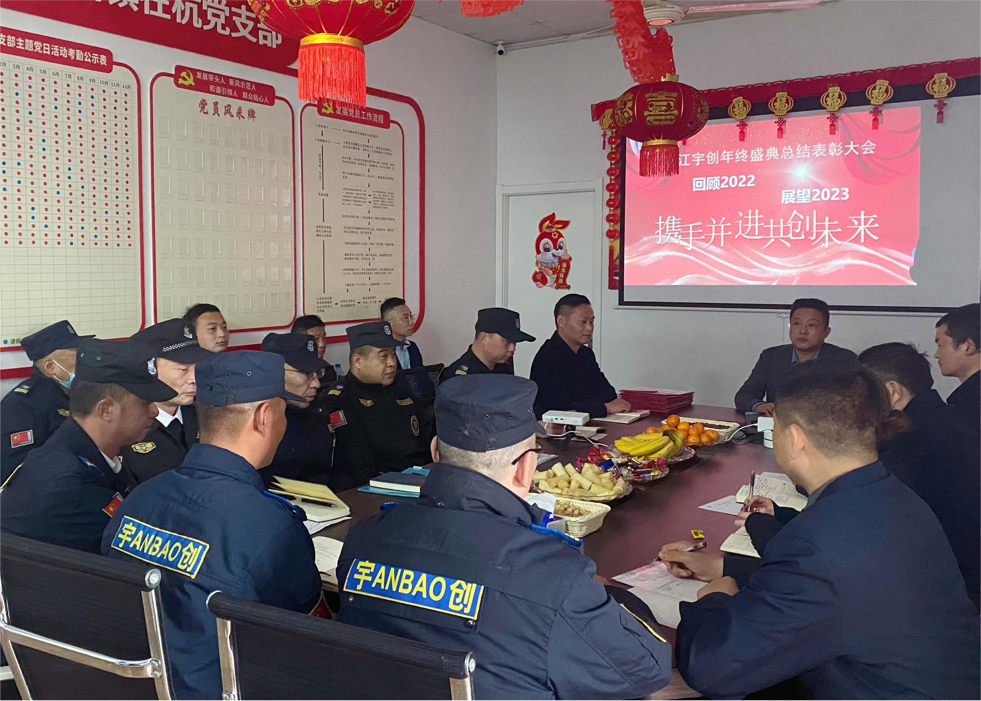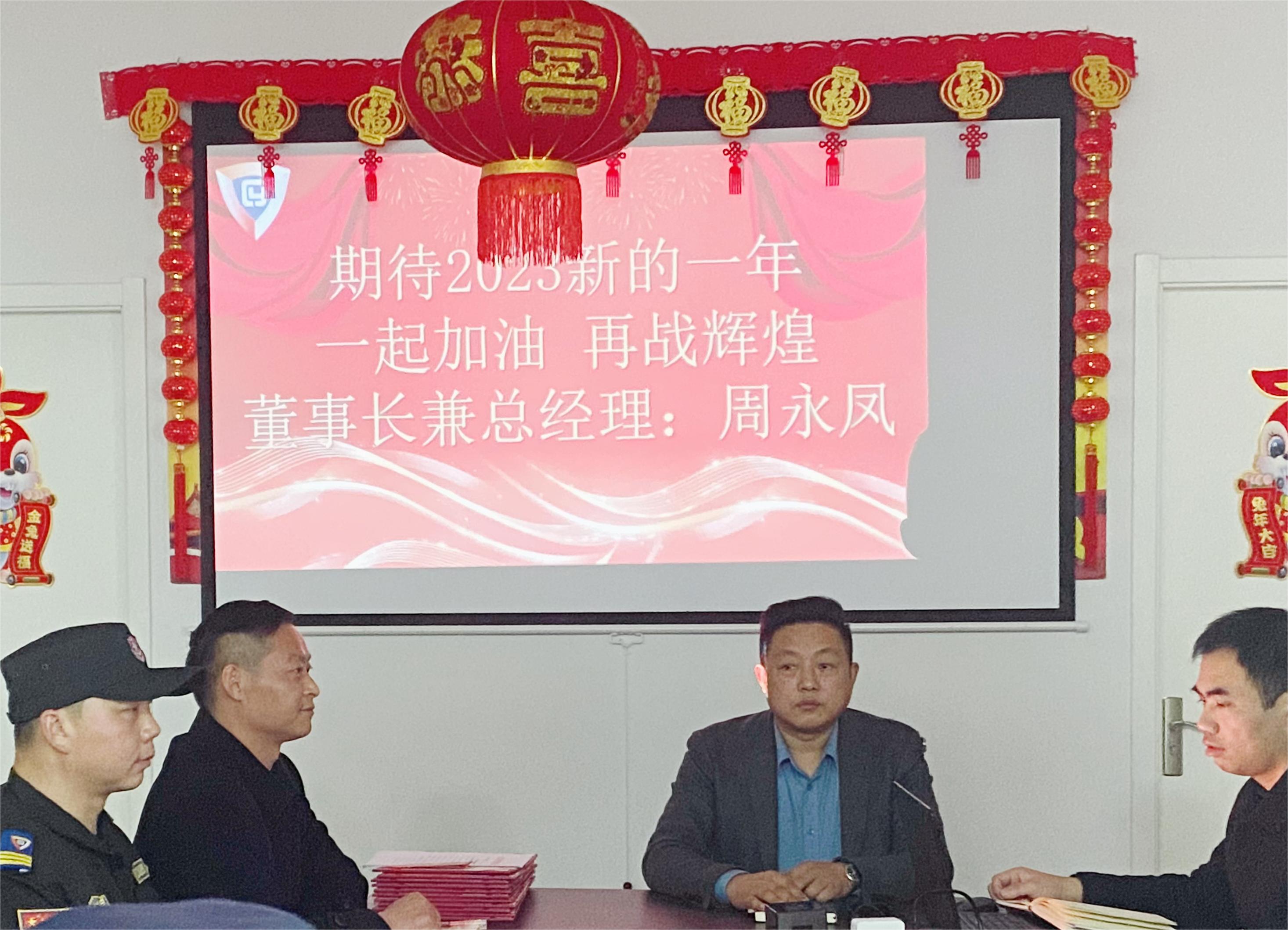 “回顾2022、展望2023”。"迎风破浪求生存,革故鼎新谋发展”。2023年1月12日下午14:30分,浙江宇创保安有限公司在总部会议室召开浙江宇创年终盛典总结表彰大会,公司董事长周永凤,副总经理胡计军及各部门、驻点负责人共计30余人参加会议,会议由副总经理胡计军主持。