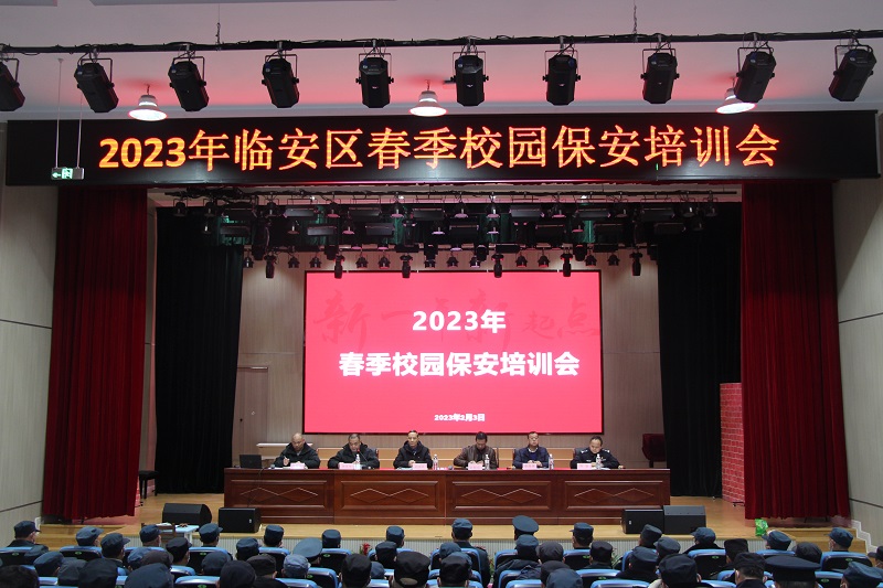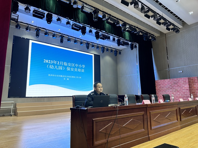 一年春作首,万事行为先。为全面做好2023年春季开学工作,迎接2023年杭州亚运会的到来,切实提高校园保安员的综合素质,维护校园安全稳定发展。2023年2月3日杭州临安保安服务有限公司联合杭州市临安区教育局举办为期一天的暑期校园保安培训,公司总经理赵南跃、副总经理陈铁军,教育局安全管理科翁向东科长、徐伟国科长,区公安局反恐大队章敏警官出席参加此次培训会。