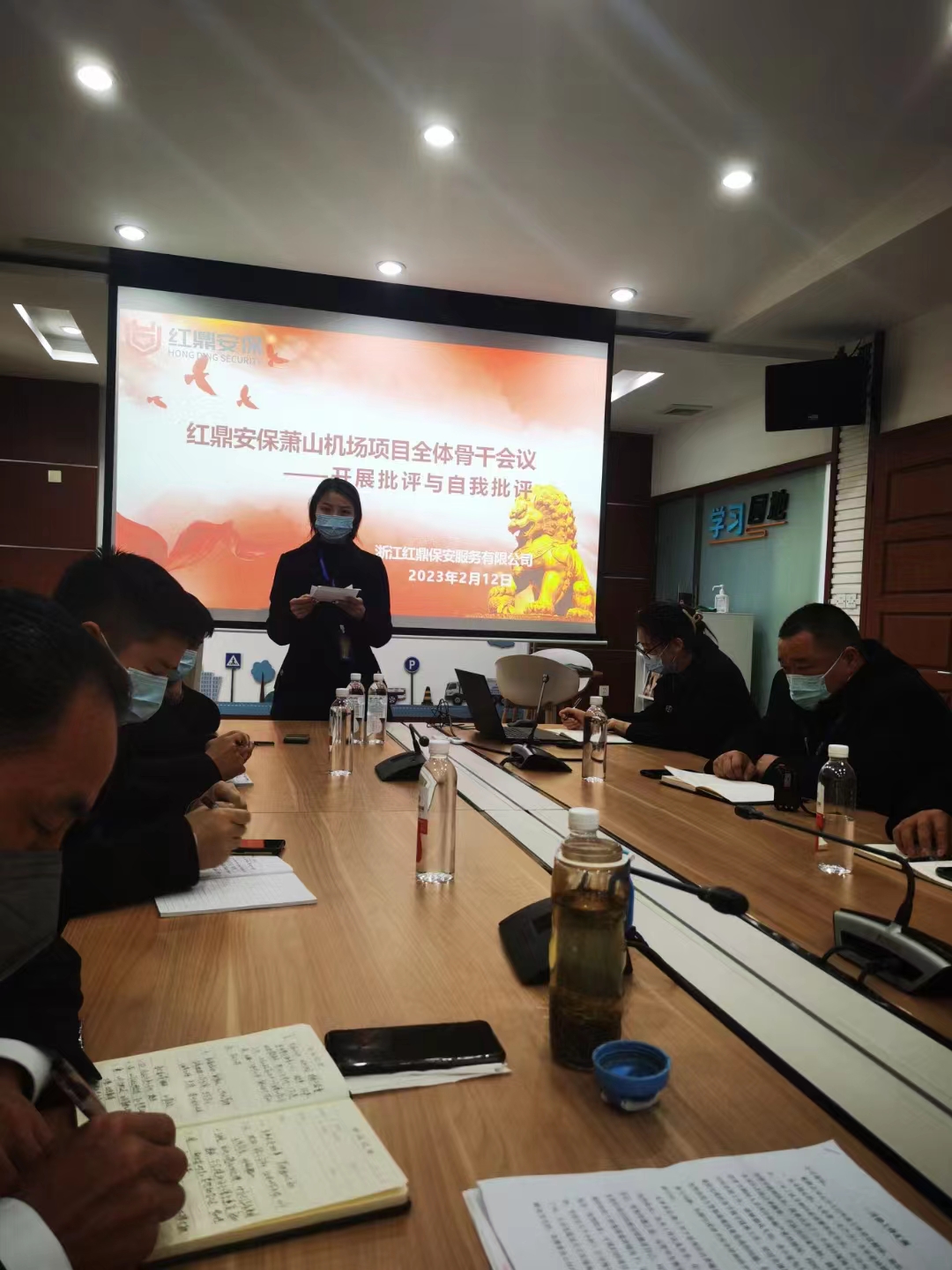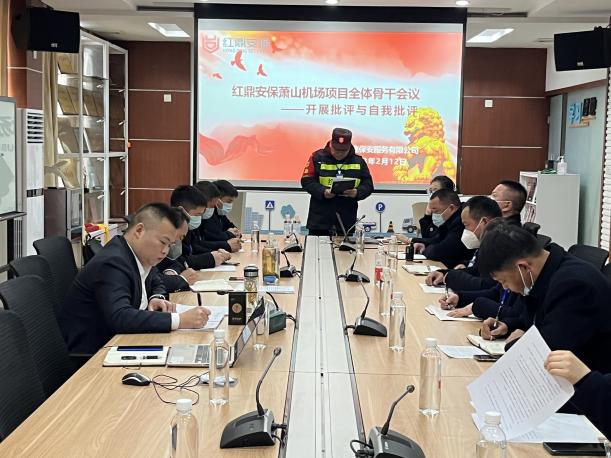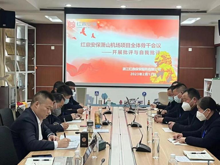 为进一步提高杭州萧山国际机场执勤工作能力和水平,总结经验教训,2月12日,红鼎保安驻杭州萧山国际机场项目点全体骨干队员开展了主题为“批评与自我批评”的骨干会议。