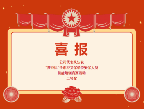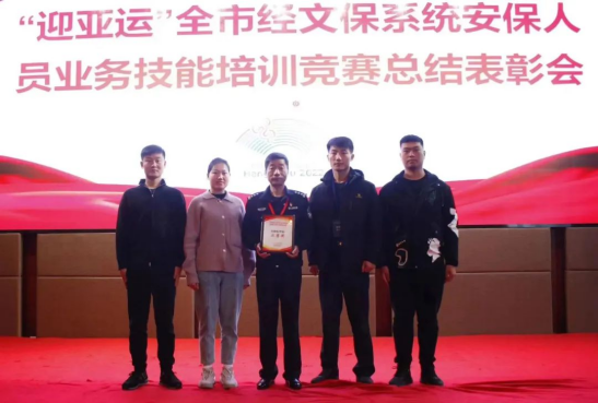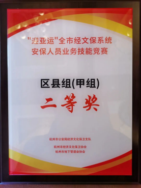 3月29日,由杭州市公安局经济文化保卫支队、杭州市经济文化保卫协会、浙江商业职业技术学院举办的“迎亚运”全市经文保系统安保人员技能培训竞赛活动圆满落幕。由景区公安分局带队、我公司选派的年青骨干保安队员组成的代表队,经过“亚运安保知识”“消防体能接力”“视频监控系统操作”“紧急救护”等环节紧张激烈的角逐,从行业单位共计14支参赛队伍中脱颖而出,获得了二等奖的好成绩。