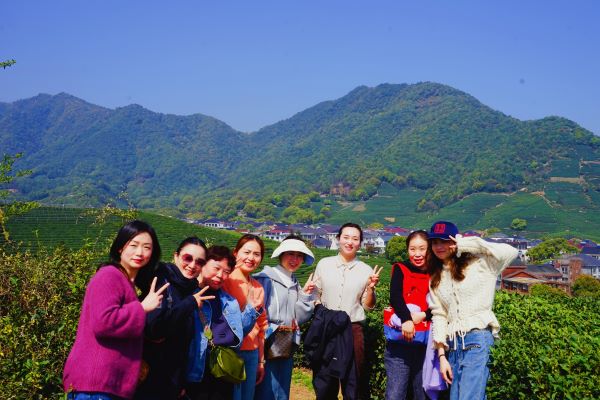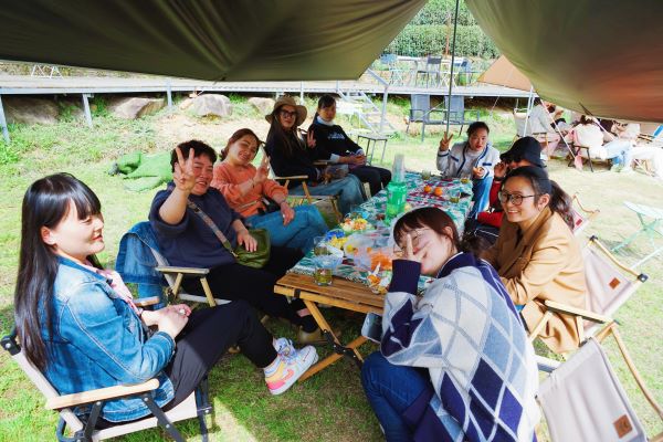 茶源谷户外营地与之江国家旅游度假区相邻,南面和北面都是大片的茶园,茶园连绵起伏,青翠连天,女职工们沿着小路观赏了苍翠的茶山,累了便坐着谈笑、品茗。