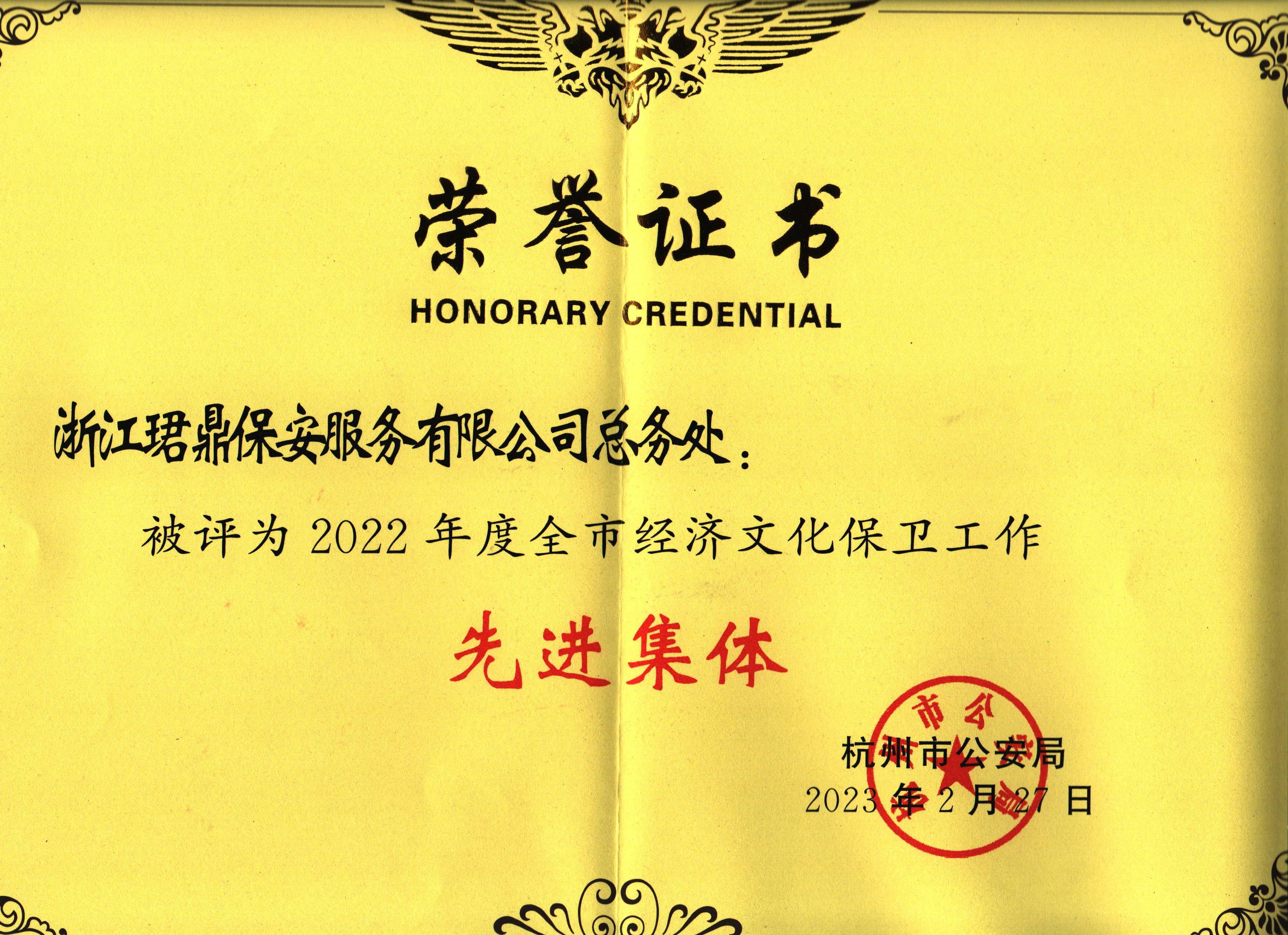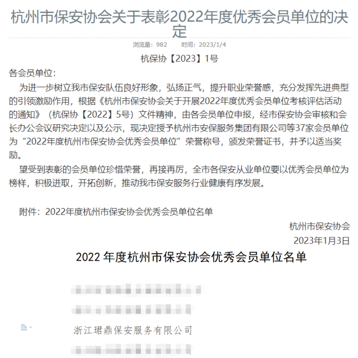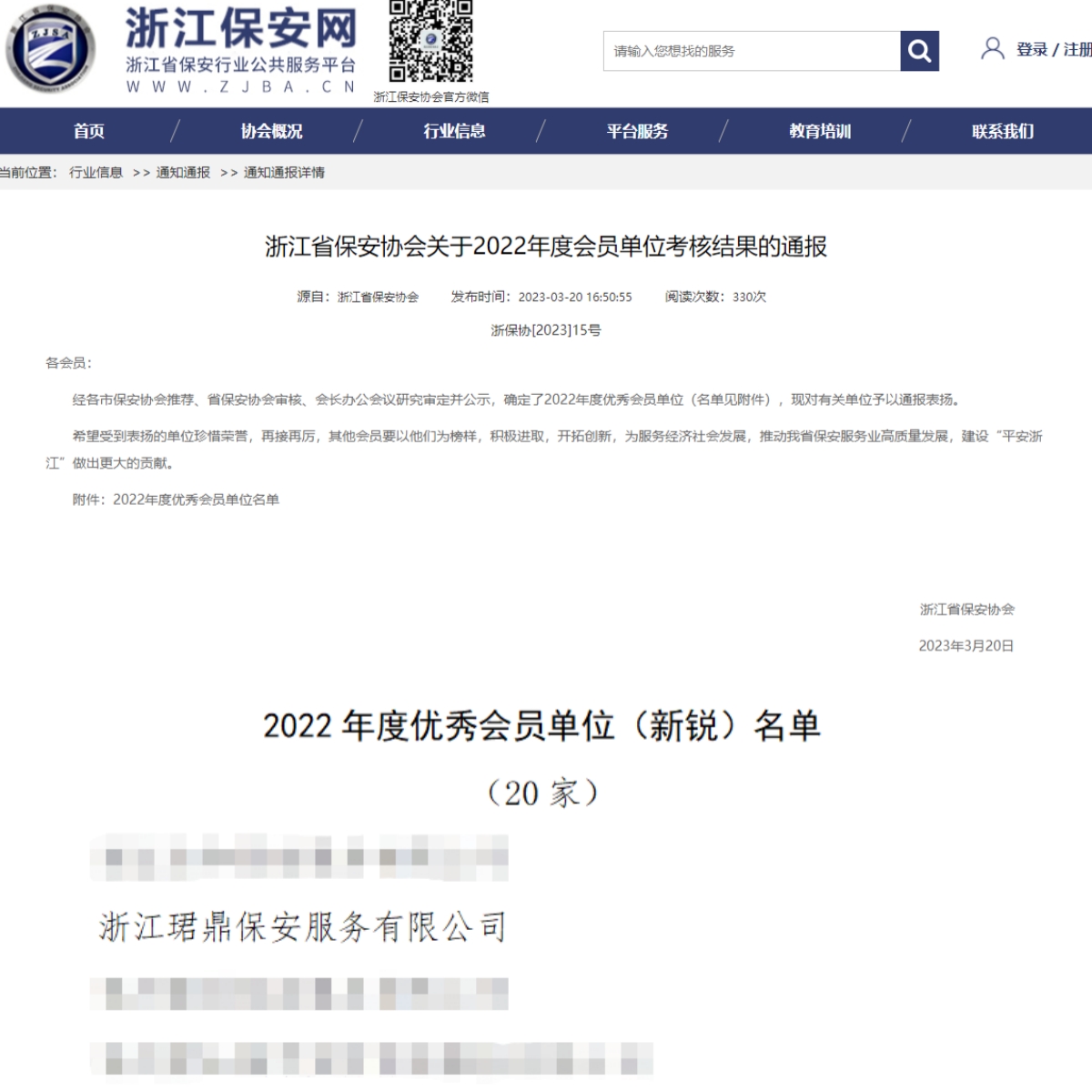 日前,从省、市保安协会及杭州市公安局分别传来喜讯,浙江珺鼎安全服务有限公司先后荣获浙江省2022年度先进(新锐)保安服务公司、杭州市2022年度优秀会员单位、杭州市2022年度经济文化保卫工作先进集体,这是我公司连续多年获此殊荣。