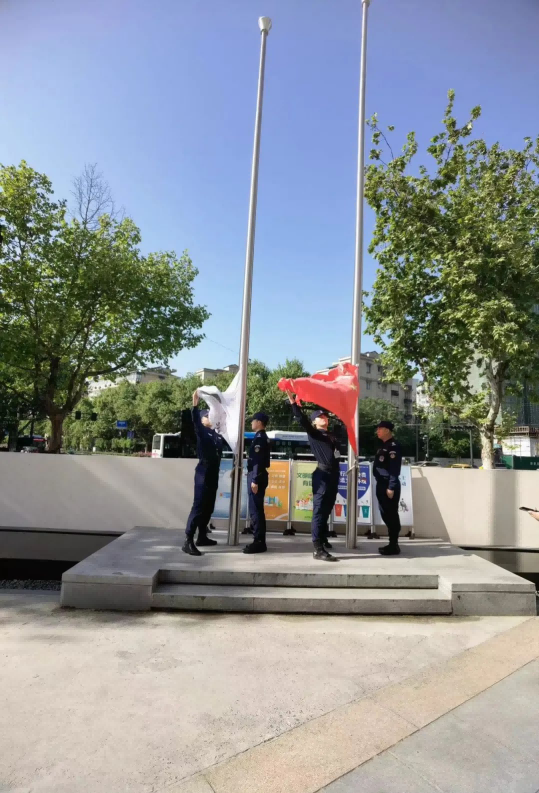 红旗漫卷迎五一,初心激荡映朝阳,上午8时整,浙江中医药大学附属第二医院升旗仪式正式开始,参加升旗仪式的全体杭泰安保精神焕发、整齐列队,随着指挥员一声令下,升旗手和护旗手簇拥国旗,昂首阔步,走向升旗台。鲜艳的五星红旗在雄壮的国歌声中冉冉升起,迎风飘扬。在新华医院丁光超院长和保卫科胡科带领下,全体杭泰安保队员立正凝视,向国旗敬礼,向劳动者致敬。