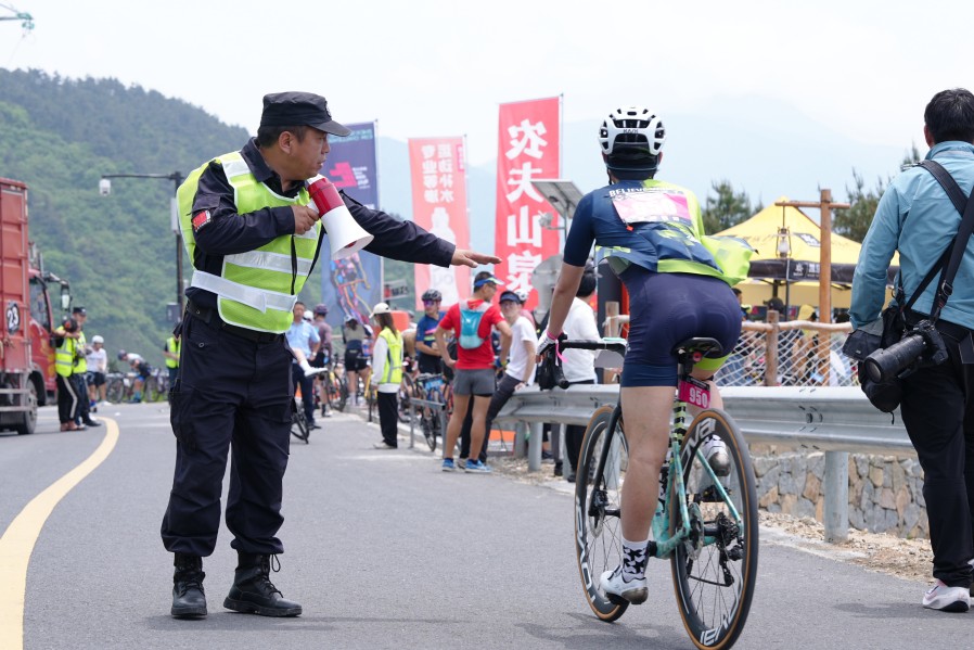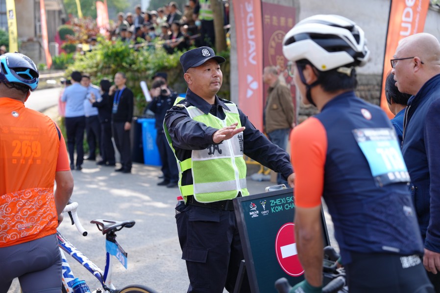 上午10:00,随着发令枪响,参赛选手们沿途你追我赶,各自展现活力风采,安保人员紧张而有序的进行现场秩序维护,以饱满的精神面貌,切实听从指挥、文明执勤,全力保证骑行赛道路无阻碍。,赛道57.3公里,累计1800米的爬升,全程都能看见他们为确保赛事安全有序进行而默默值守的身影。