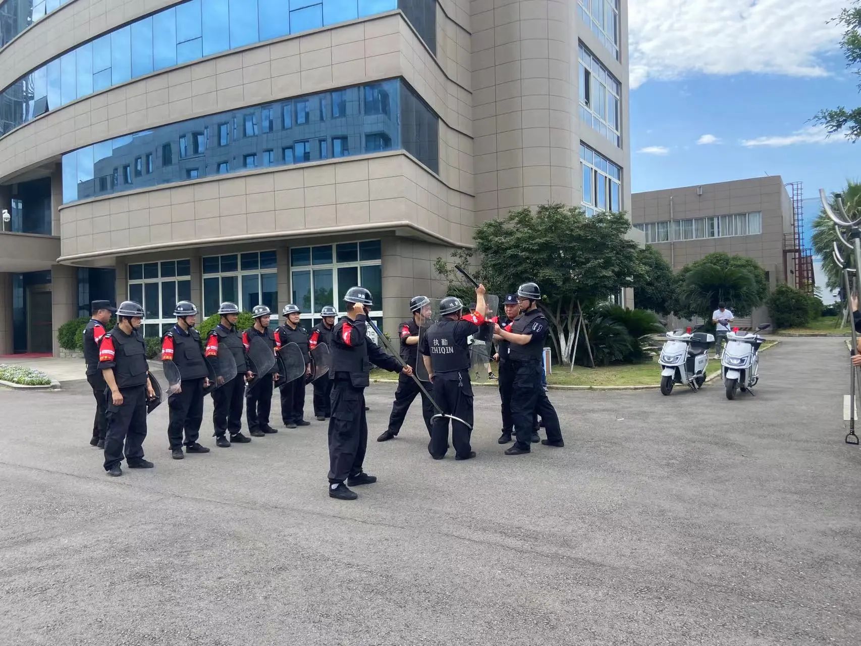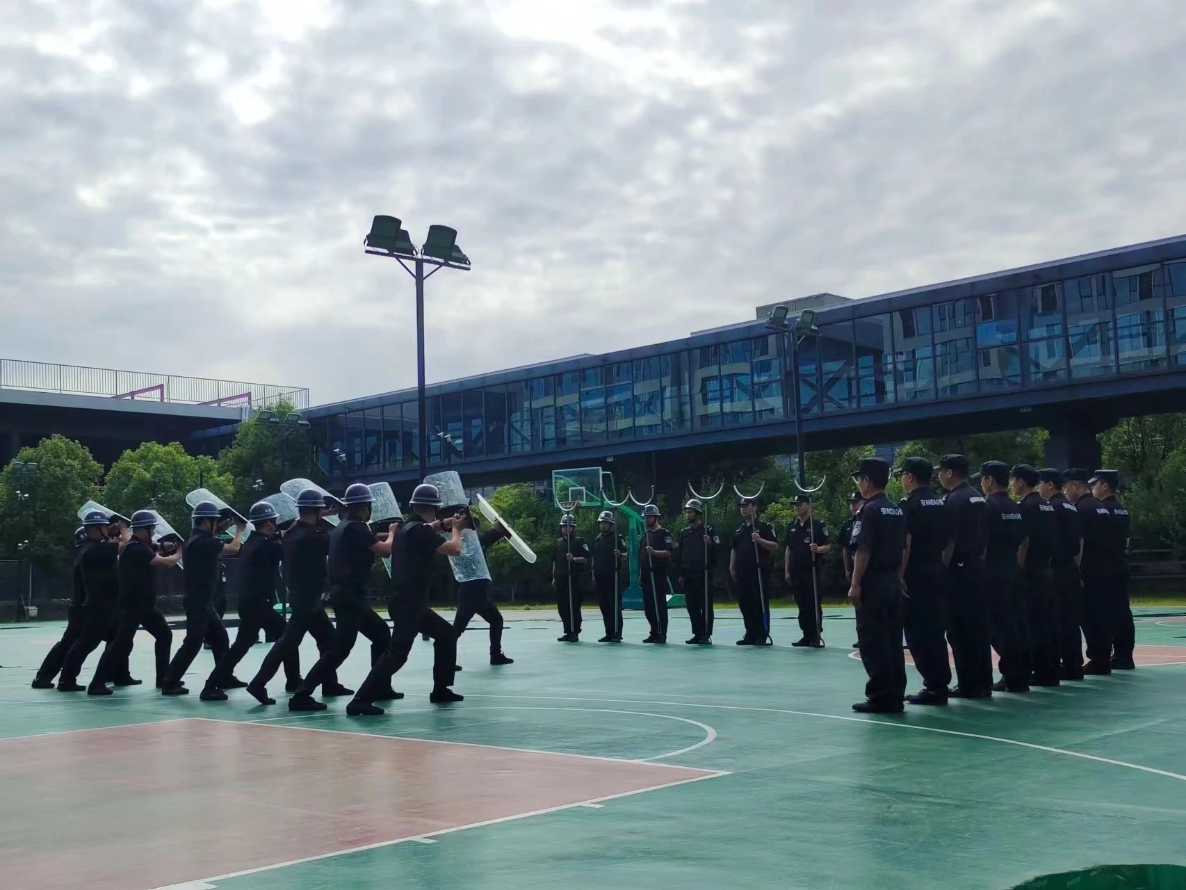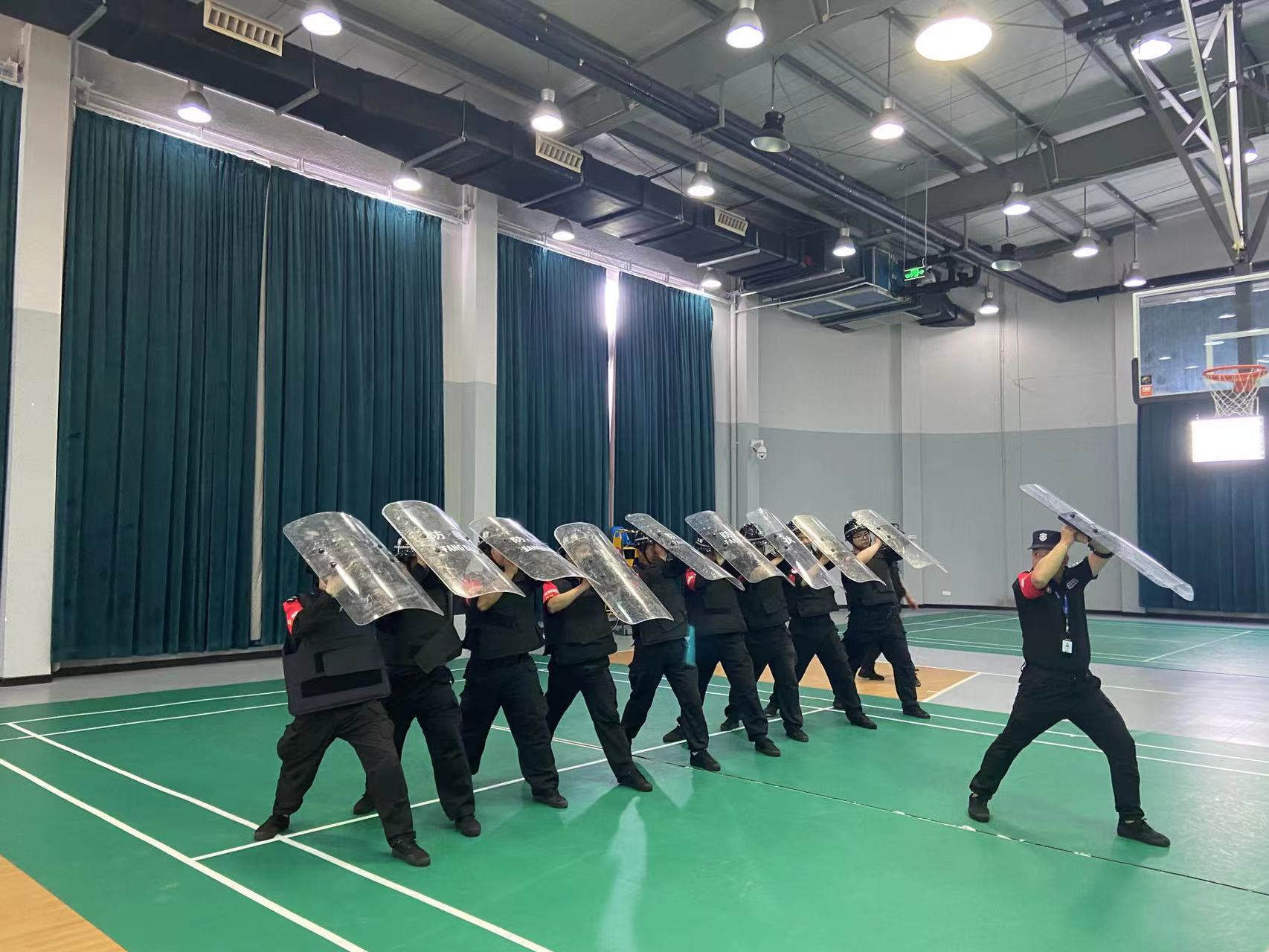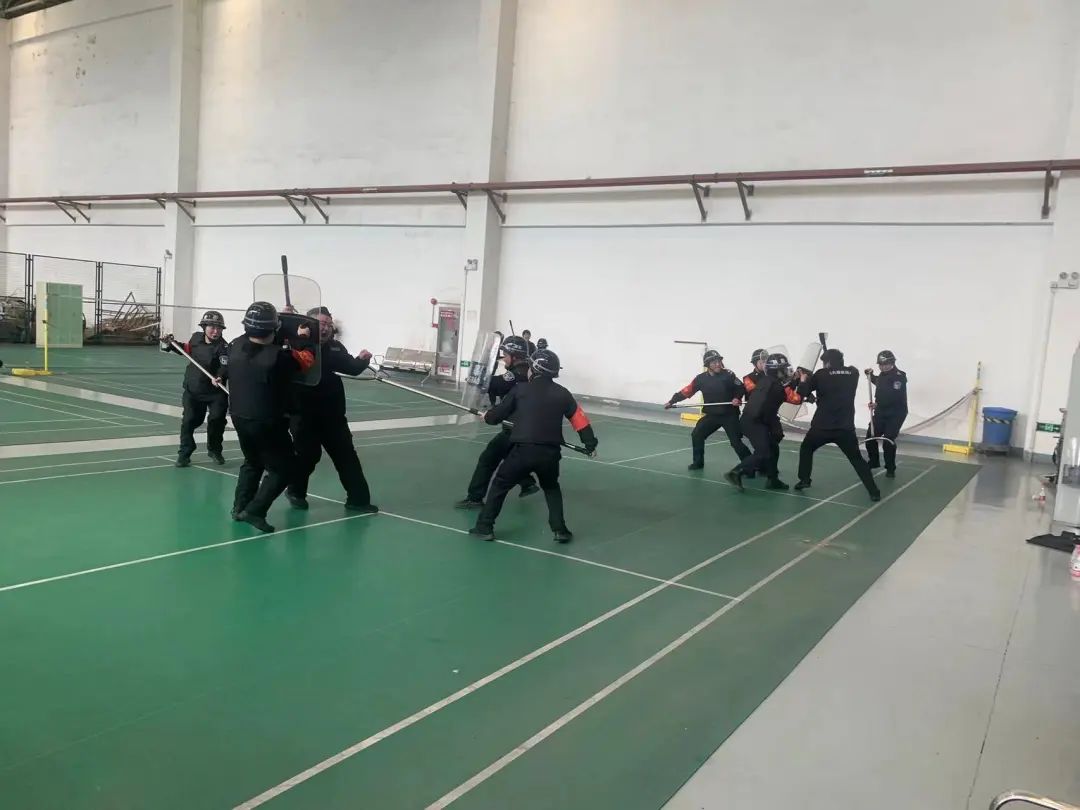 在蜀山基地、大华富阳生产基地,督教部组织开展了反恐防爆实操演练,讲解了钢叉、盾牌等防暴器械的功效及正确使用方法,五人一组开展实操演练。