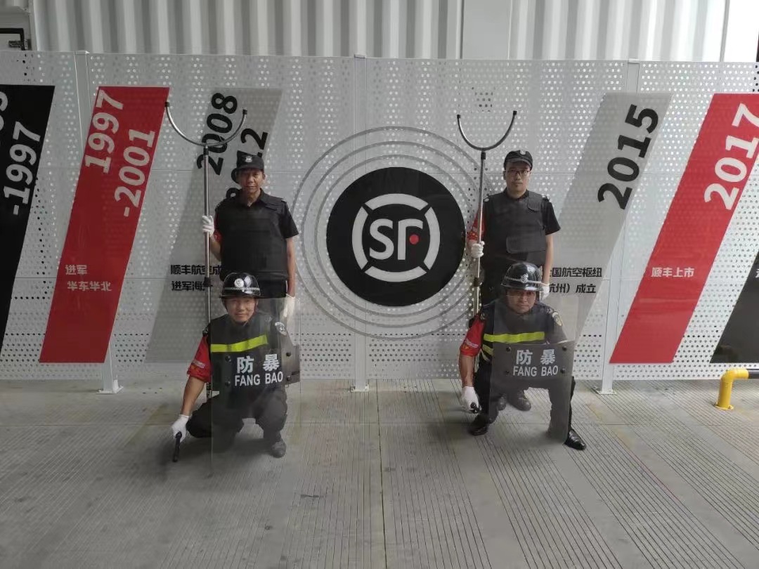 演练正式开始,模拟两名不明身份人员强行闯入物流园区,威胁园区工作人员人身安全。项目队员发现后迅速反应,立即上报,启动防恐应急预案,防暴应急小组迅速装备好防暴器械赶赴现场。队员们利用盾牌、钢叉等防暴器械将“不明人员”阻挡制服,及时报警。演练结束后,项目队员交流心得,做出总结经验。