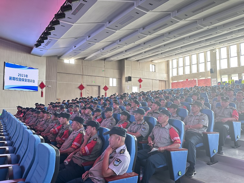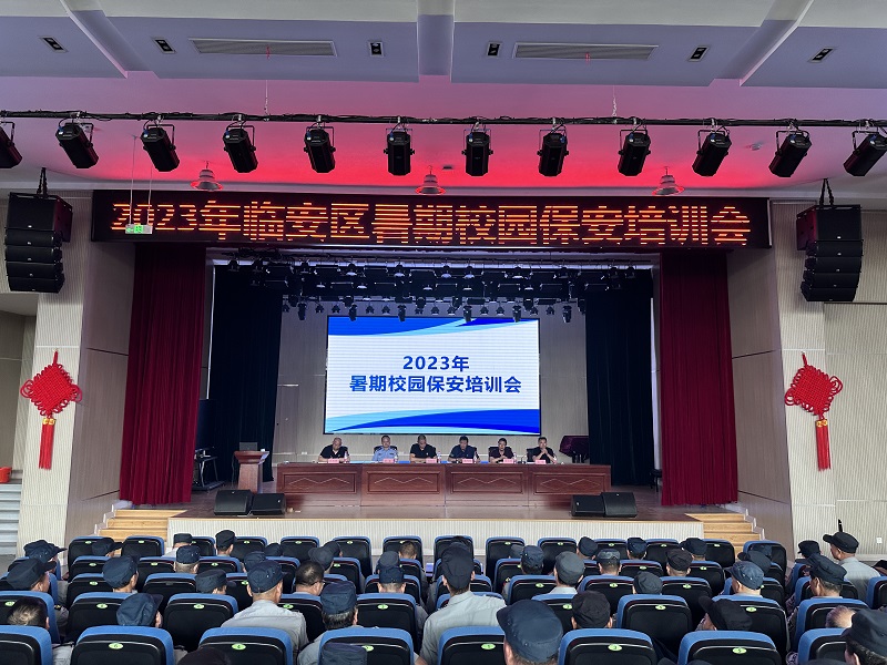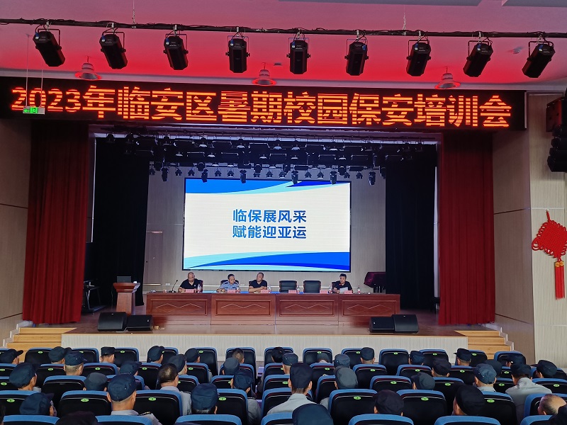 为全面提高学校安保队伍的整体素质,确保新学期校园安全稳定,同时更好地迎接2023杭州亚运会的到来,2023年8月18日,杭州临安保安服务有限公司联合临安区教育局举办暑期校园保安培训会。保安公司副总经理陈铁军、保安部经理赵明对在场保安员做培训要求,教育局安全管理科科长翁向东、徐有青分别重要讲话,区公安局反恐大队警官章敏做“中小学校园反恐知识”专题讲座。