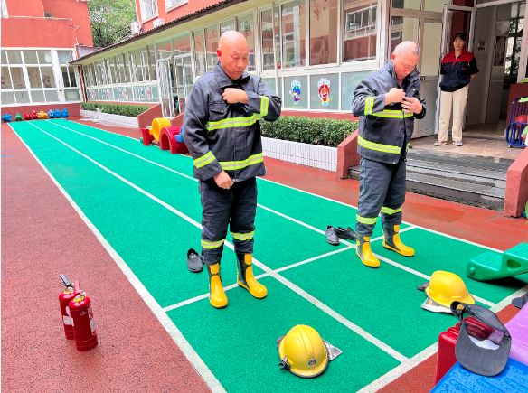 首先是单人50米着装(消防战斗服)实操环节,只听一声令响,保安队员迅速奔跑冲向50米放置消防战斗服处,快速着装,穿好服装返回原点。此项演练是为保证在遇到火情时,保安队员能用最快的速度换好消防战斗服,在保护好自己的前提下前往救援。
