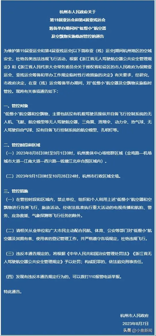 2023年8月7日,杭州市人民政府发布《杭州市人民政府关于第19届亚运会和第4届亚残运会筹备举办期间对“低慢小”航空器及空飘物实施临时管控的通告》,2023年8月8日0时起,将对“低慢小”航空器及空飘物实施临时管控。